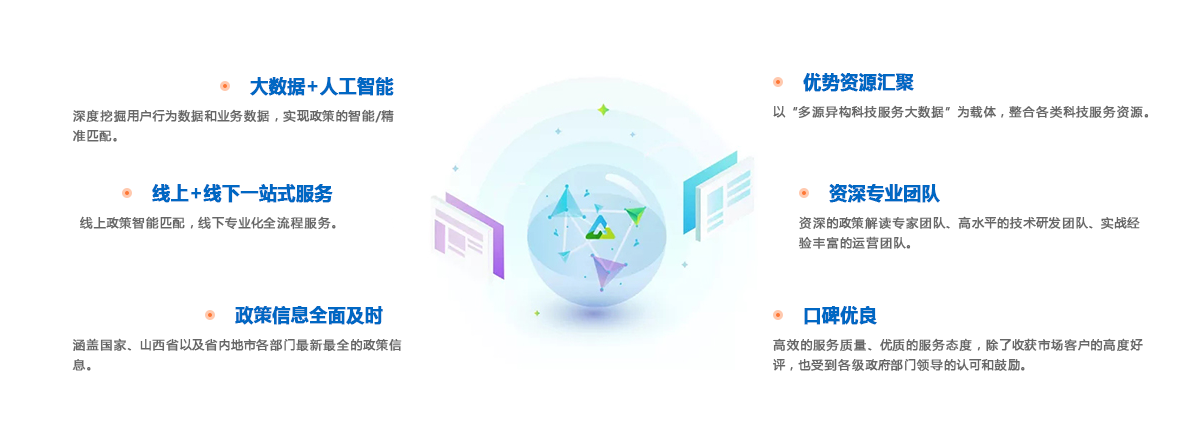 我公司自主研发出“企策通-综合服务平台”是一款链接政府、企业、服务机构的科技创新综合服务平台。以集合国家、山西省及各地市的政策信息为出口,为省内企业,提供多领域的服务。赋能政策落地、企业成长、第三方机构资源匹配。